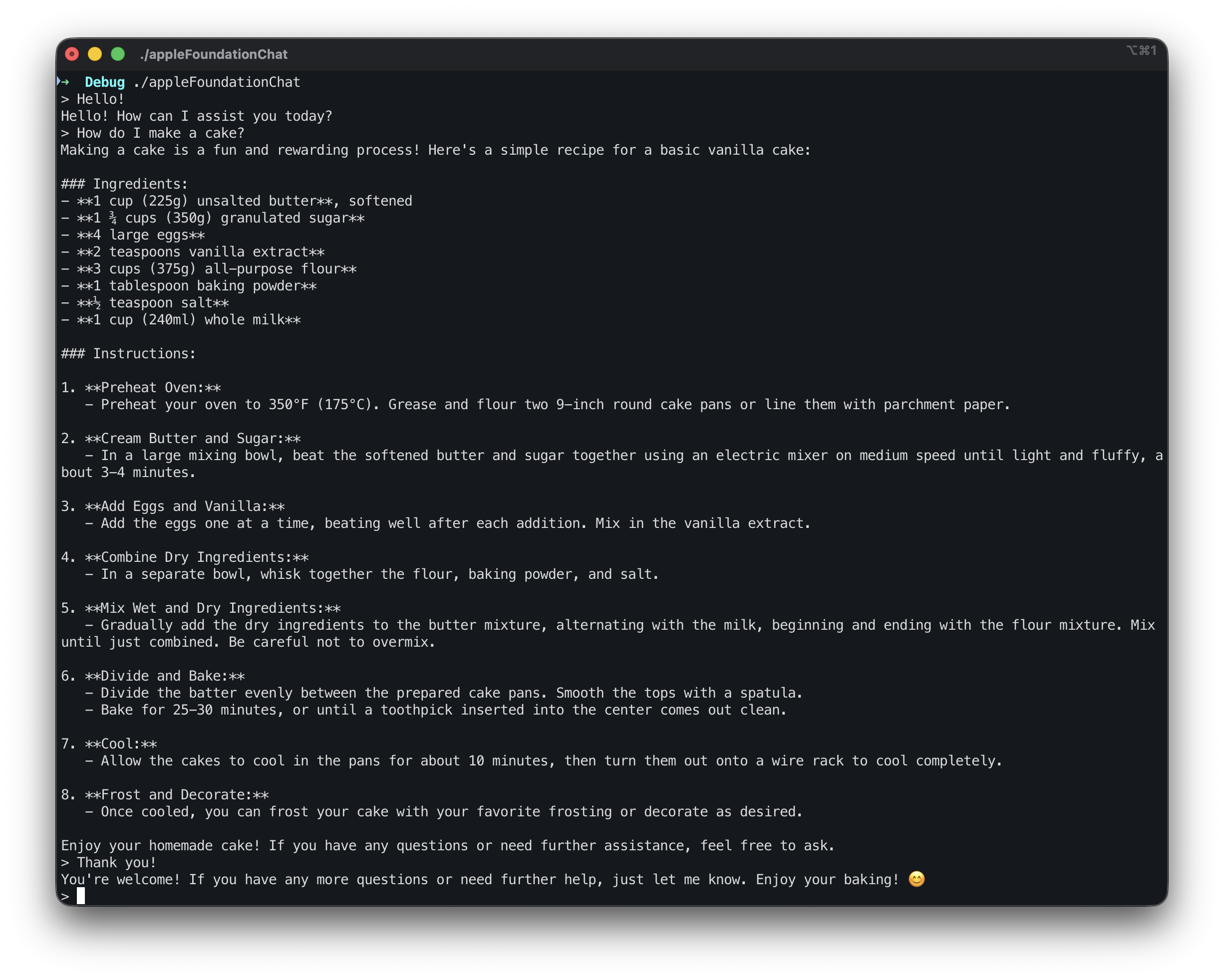 , and it will still maintain the context of the current session. In other words, we could write a program that allows us to keep chatting with the LanguageModelSession()