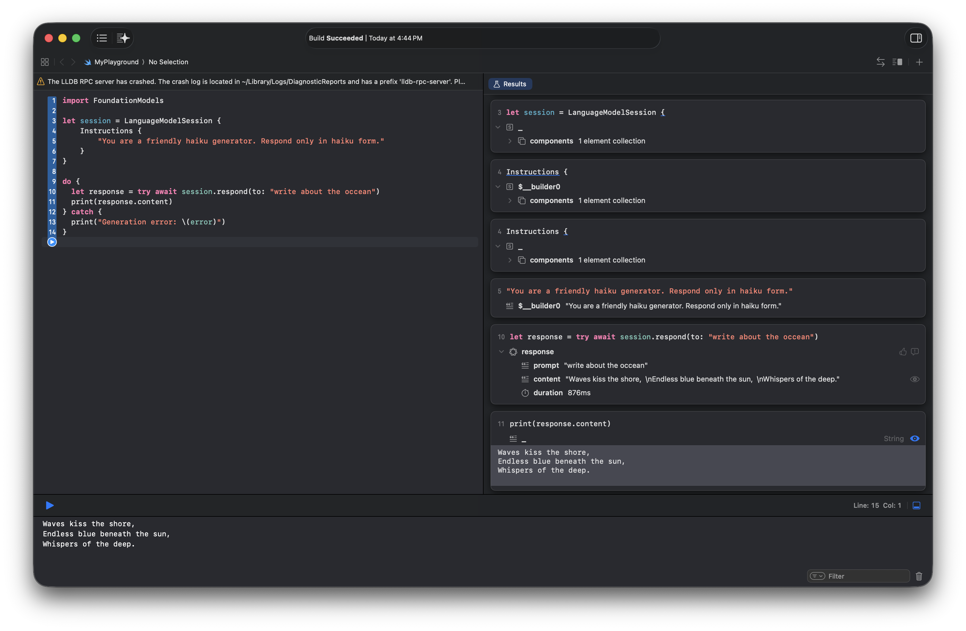 Here is the most basic method of sending a request to Apple's Foundation Models. You can run this code in Swift Playground2: